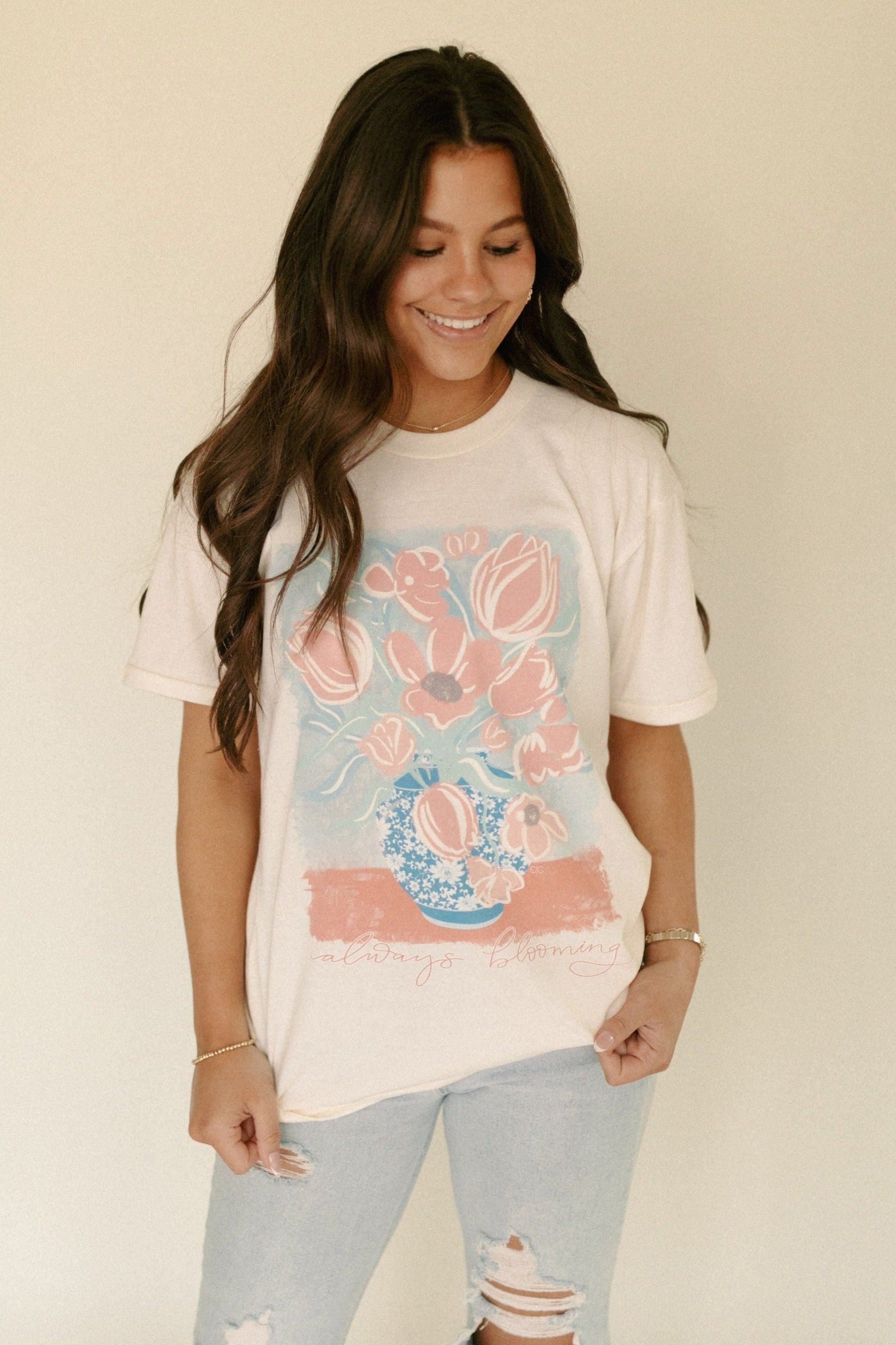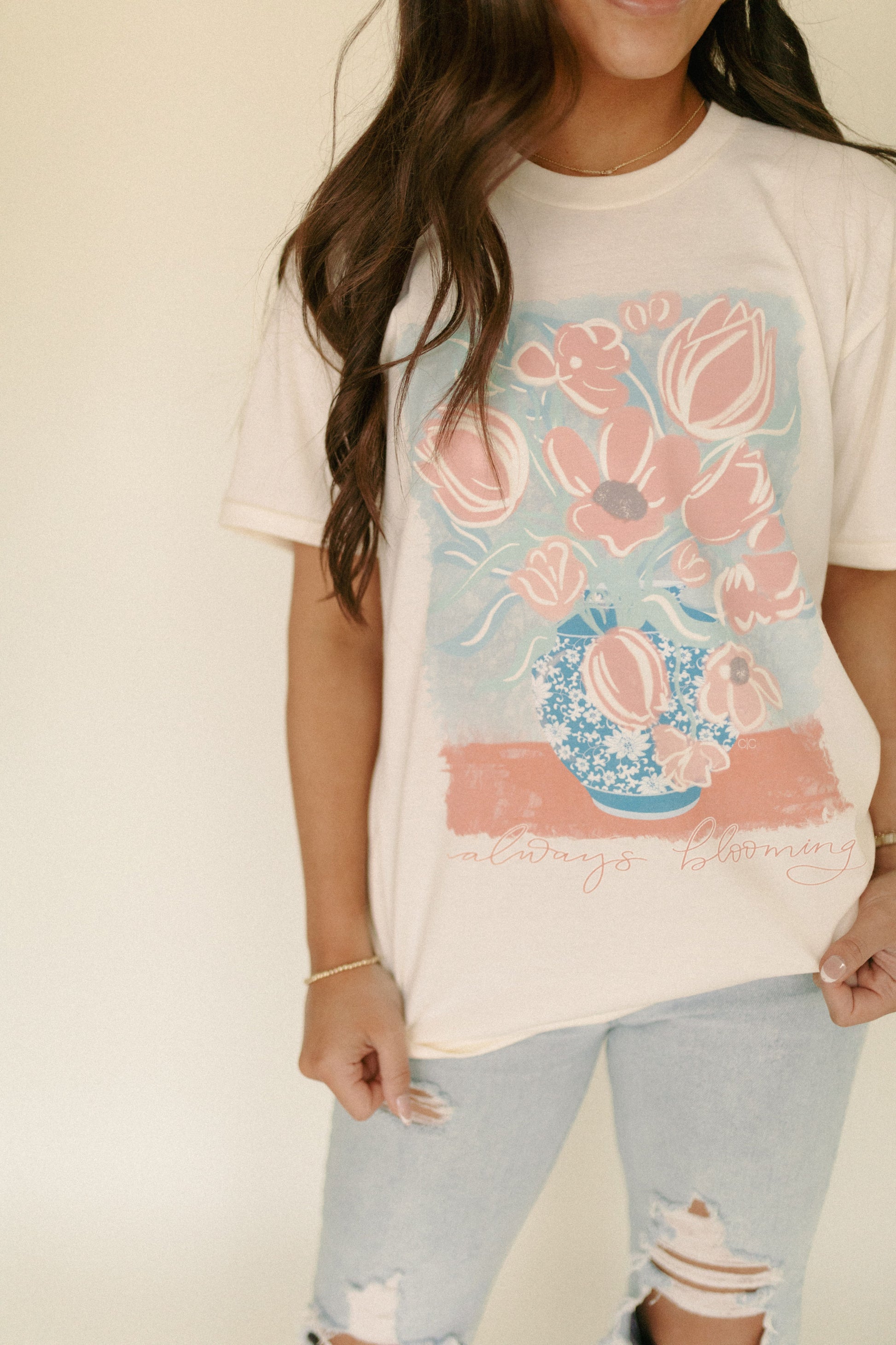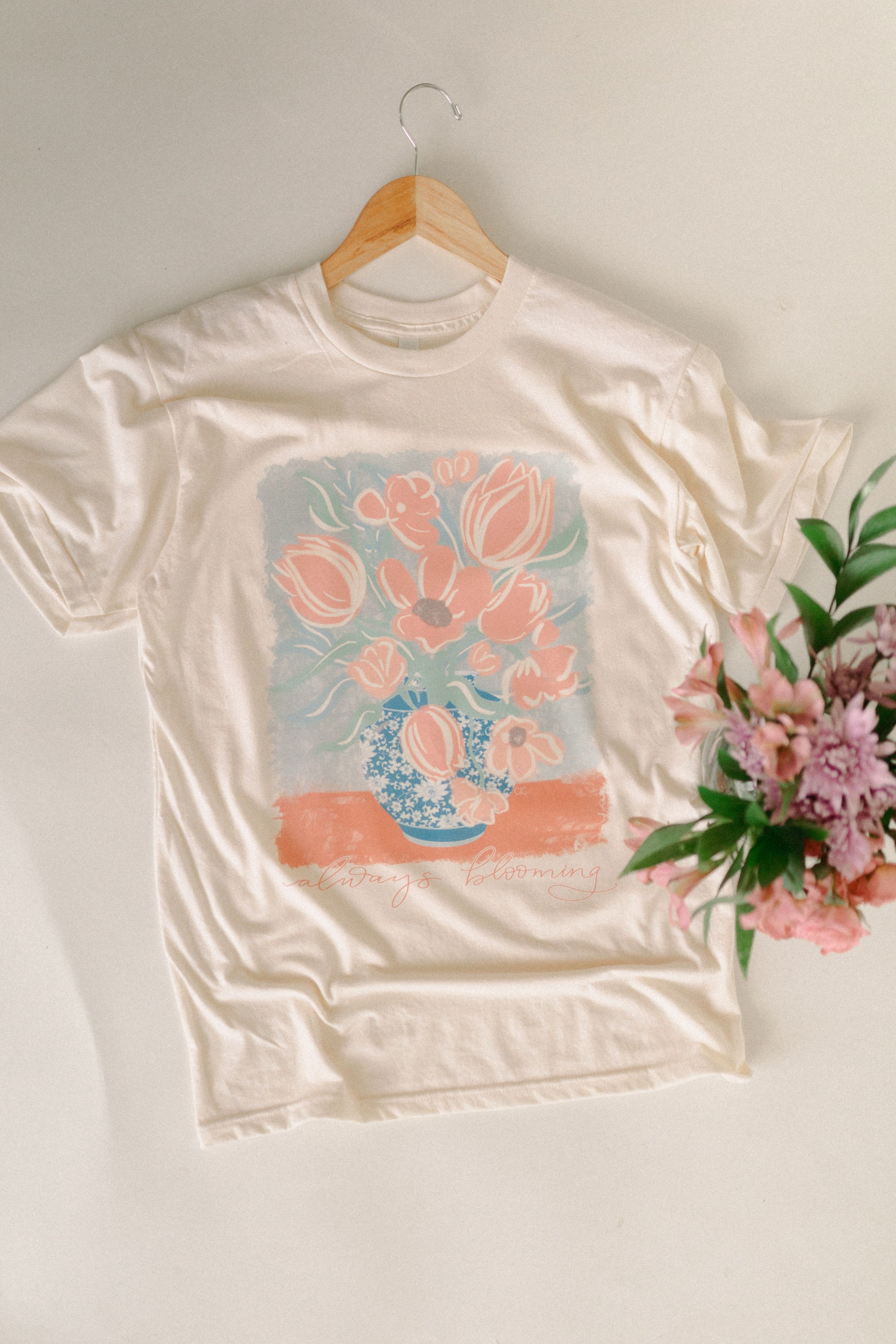 Get ready for a touch of whimsy with our " Always Blooming " graphic - ft the trending chinoiserie printed vase with our hand-drawn floral boutique.