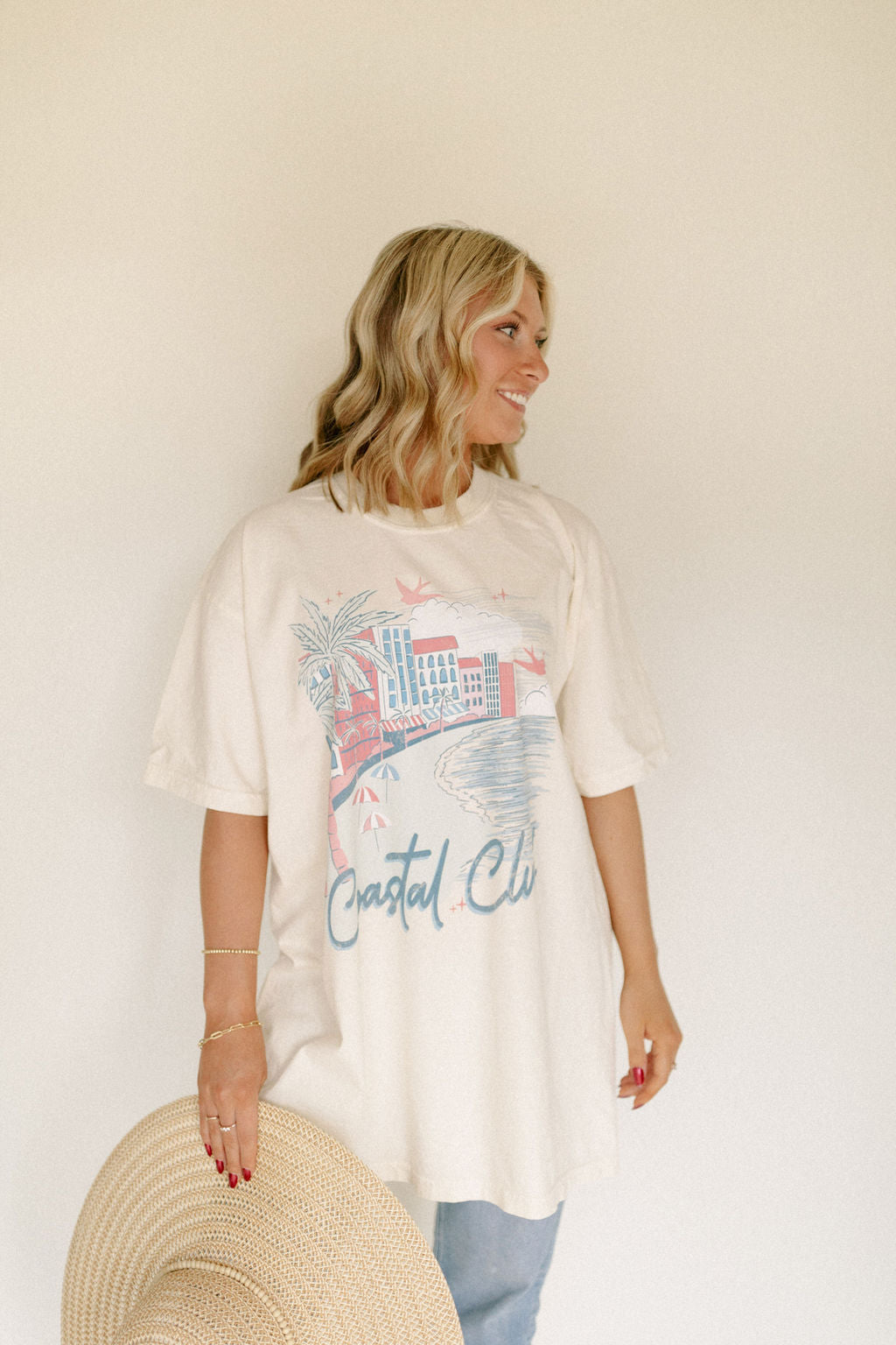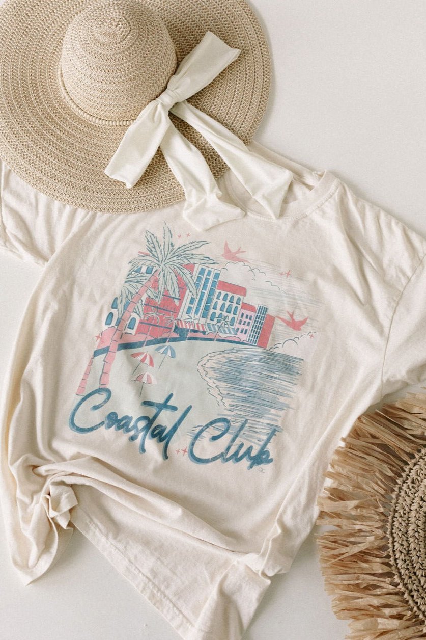Our whimsical ' Coastal Club' tee, captures the sunny side of seaside! A blend of soft pastels and tropical hues. Printed on an ivory Comfort Color Tee, ring spun 100% cotton