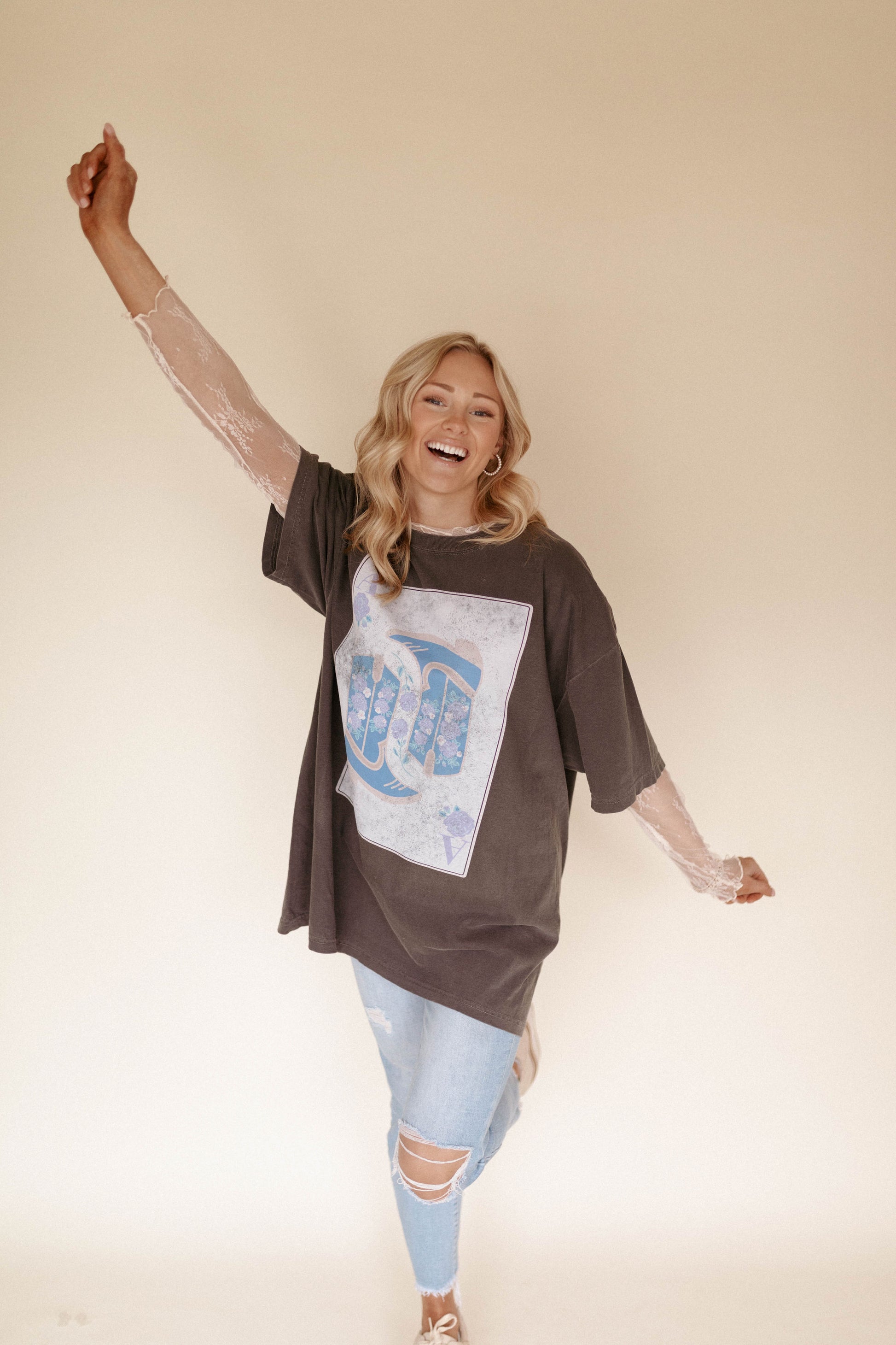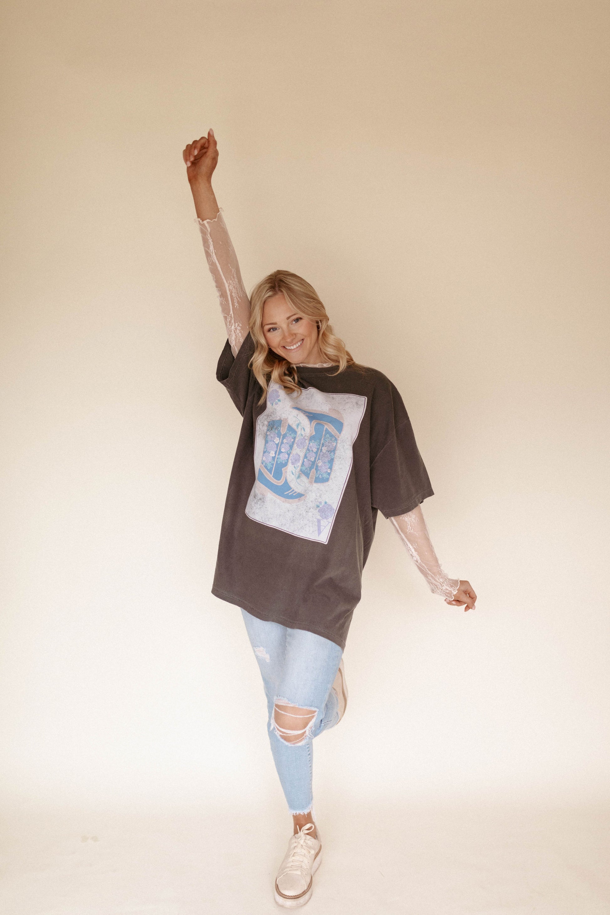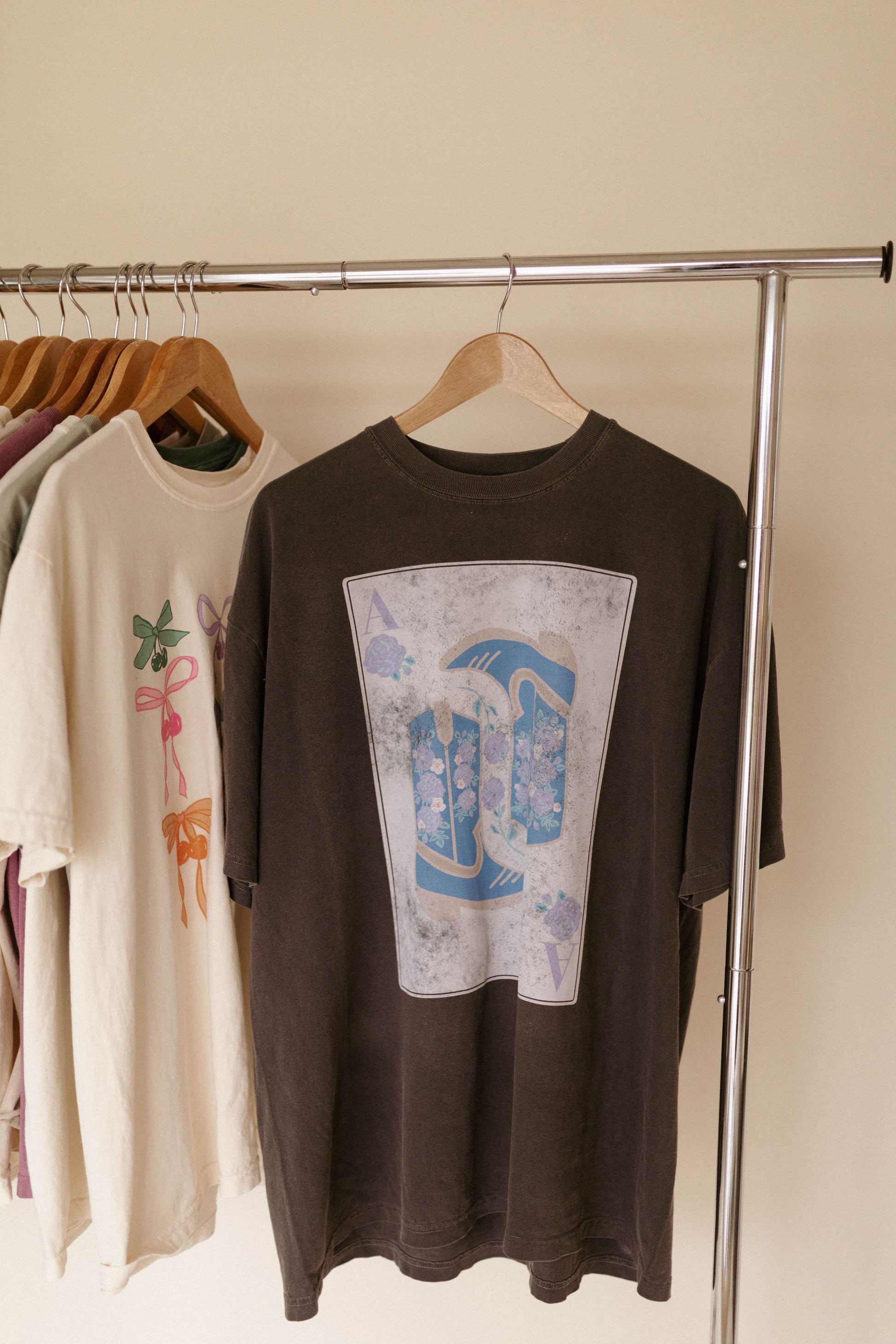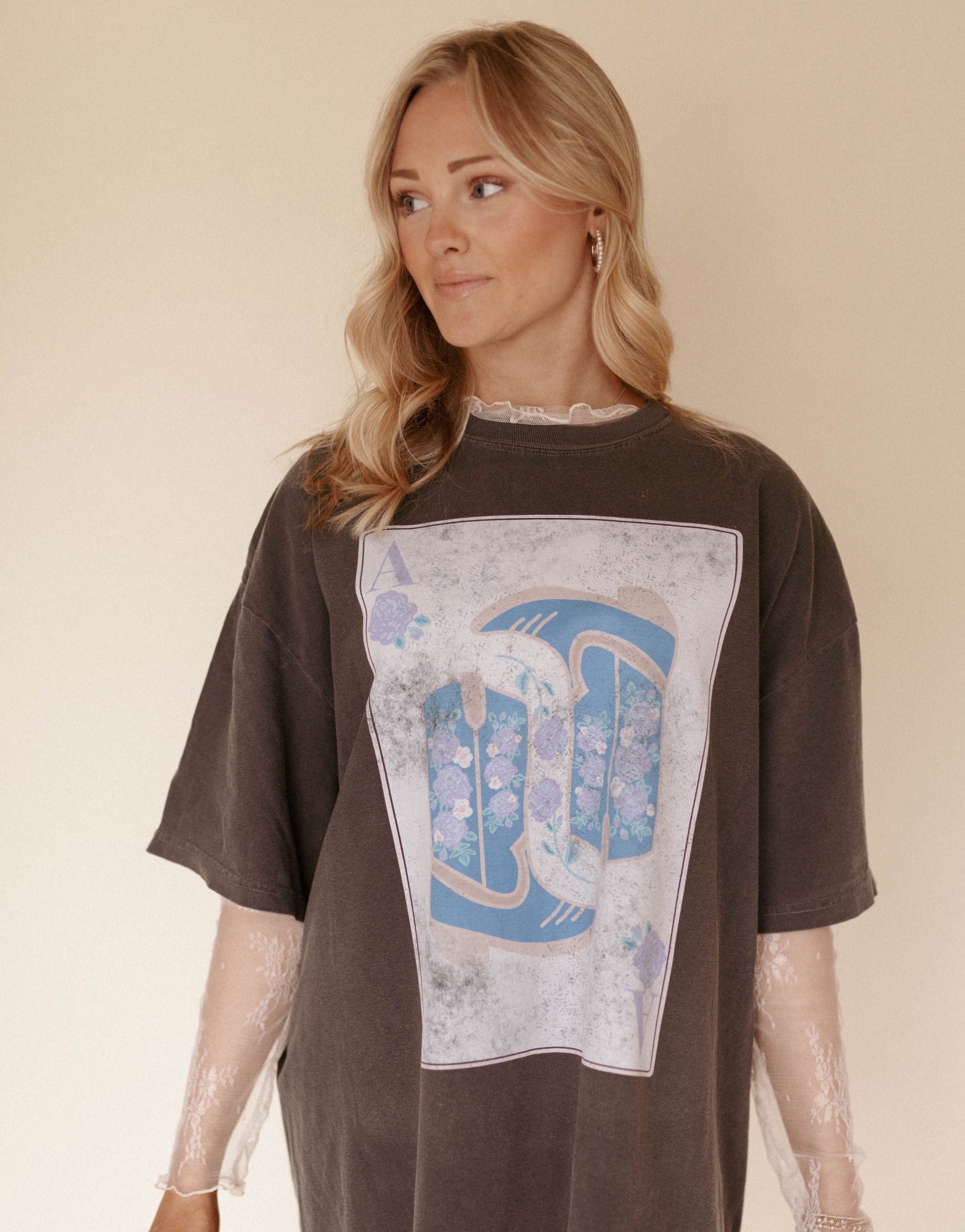 This charcoal tee is printed top to bottom featuring our Cowgirl Boots Playing Card! She's decorated with fun florals and pops of color! Our distressing adds a fun vintage inspired vibe