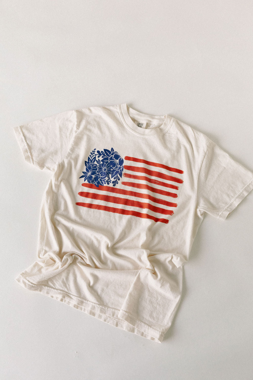 A new way to design a patriotic flag. Featuring our hand-drawn floral + stripe Flag. Printed on an ivory Comfort color tee.